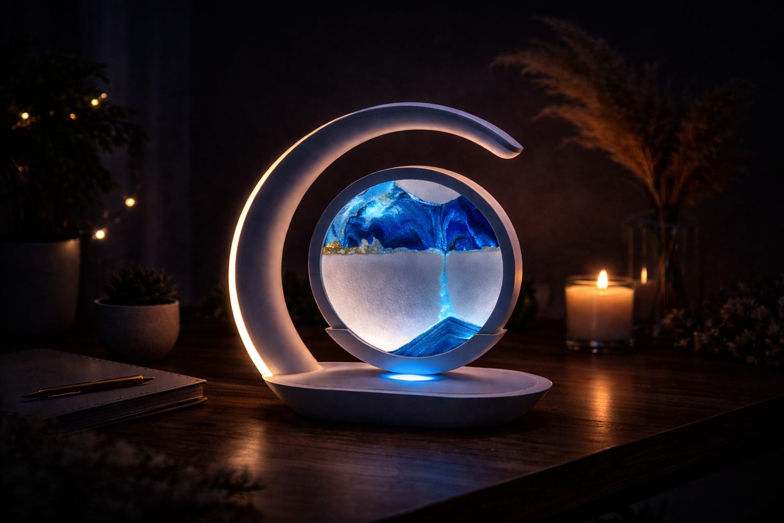 slow-moving sand and adjustable LED colors, helping you relax and ease